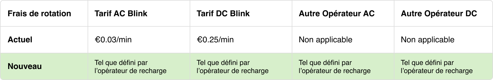 Sur les bornes non‑Blink, exploitées par d’autres Charge Point Operators, nous répercuterons désormais le tarif de rotation tel que fixé par le CPO tiers.